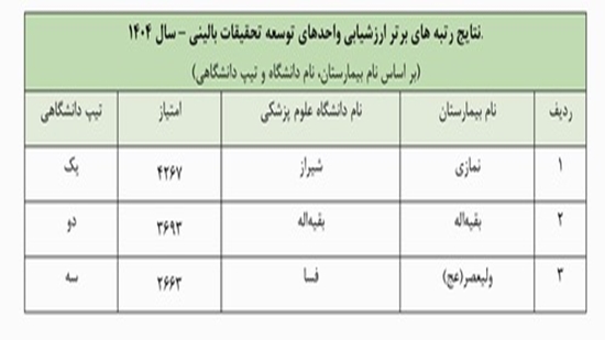 به گفته رییس مرکز توسعه، هماهنگی و ارزیابی تحقیقات معاونت تحقیقات و فناوری وزارت بهداشت بر اساس این ارزشیابی، واحدهای توسعه تحقیقات بالینی بیمارستان نمازی از دانشگاه علوم پزشکی شیراز، بیمارستان بقیها... (عج) از دانشگاه علوم پزشکی بقیها... (عج) و بیمارستان ولیعصر(عج) از دانشگاه علوم پزشکی فسا، به ترتیب صدر نشین برترین های این رقابت در دانشگاههای تیپ یک، دو و سه بودند.