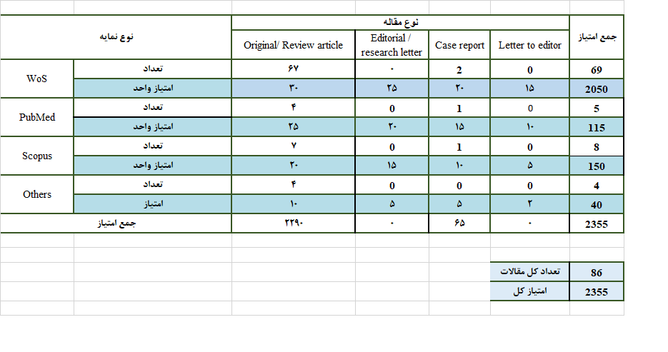 جدول درج مقالات در ارزشیابی 1401